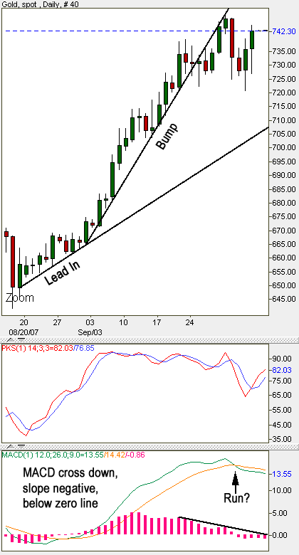 The daily chart appears to be describing a Bump and Run Reversal or Bump and Run Formation (BARF) as Thomas Bulkowski originally called it. Read about the Bump and Run Reversal and then look at the daily interval gold chart below.