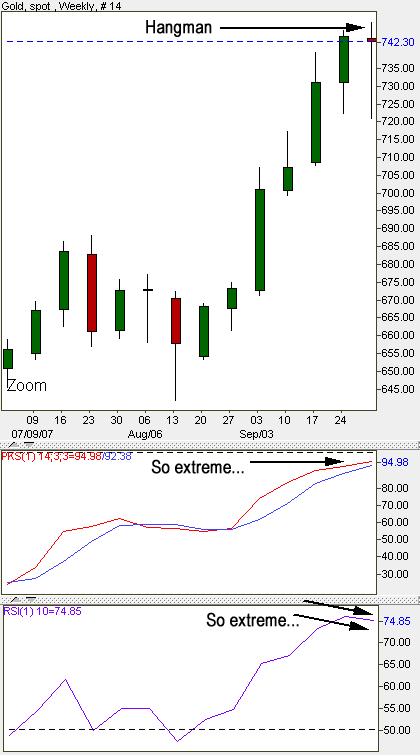 The weekly chart just formed a hangman. I’m not much of a Japanese candlestick freak, but I have a basic knowledge of them and that looks like a bearish hangman with long shadow to me. Weekly stochastics are in extreme overbought territory (up in the 90s). Remember what I said about taking extreme band entries in the direction of the trend… Very risky. And this is the weekly interval. (Although, I bought a couple of grams the other day—anyway—during a dip.) In addition, weekly RSI is 74.85. This is also extremely overbought, and the RSI slope just turned negative for the first time in several weeks.