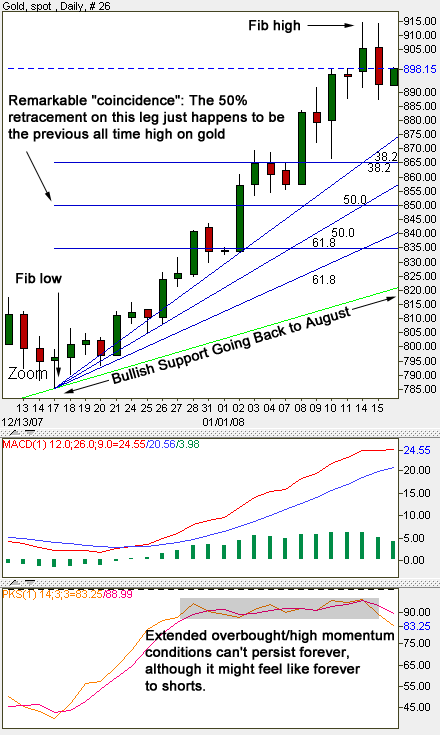 The move on gold has been so extreme for so long that I thought I’d take a look at it from a technical perspective. Since we’re above the previous all time high of $850 (yes, I know that the dollar is worth less now than in 1980), and the usual indicators aren’t reliable in these extended overbought / high momentum times, I drew a Fibonacci fan and retracement grid on the recent daily gold chart to try to get an idea of where some near term supports might be.
