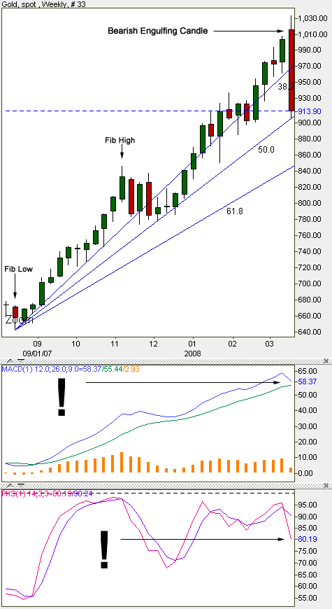 Traders looking to preserve longer term profits, or traders with shorter time horizons, might consider using that 50 line as a stop loss target. A move below around $900 probably means that the unwinding weekly stochastics are in force and that a full oscilation down is likely. The resulting move down could easily reach $850 (major support), or below. Weekly MACD, while still positive, is threatening to turn negative for the first time since mid August 2007. A retest to around $850 would meet the historical price support at that level as well as the 61.8 fan line.