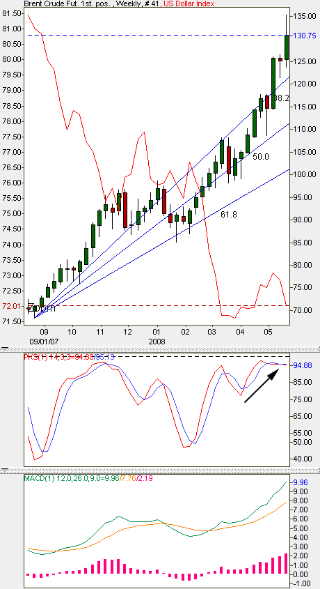 The U.S. Dollar Index is getting down into a support zone, along with a low band daily stochastic. A crank rally on the dollar would likely blow the columns out from underneath the oil; short term, anyway. Why? Look at the weekly oil chart. The stochastic is wound up like a three day clock, and it has been extreme for weeks. If the dollar does anything but decline sharply, oil could decline sharply.