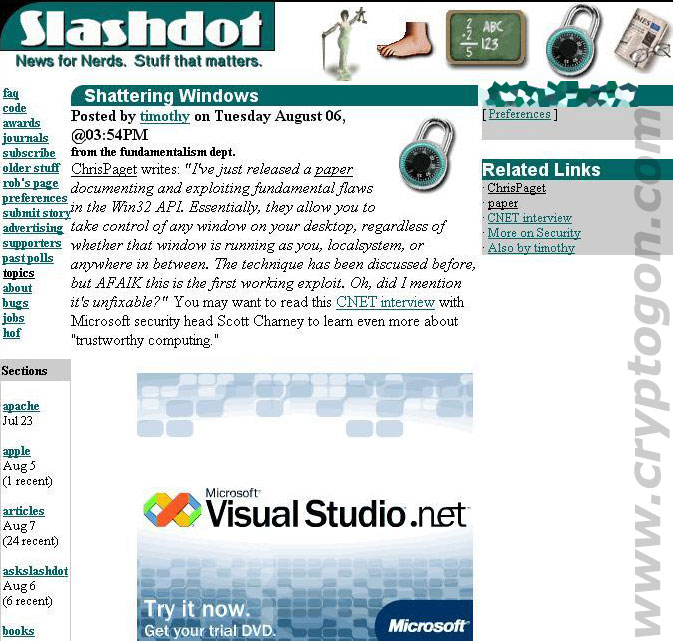 Microsoft Windows is Hopelessly F*cked :.We could be days, hours or minutes away from catastrophic hack-attacks and it's all due to the fact that Microsoft's operating systems are critically flawed. And these bozos expect all of us to go along with their plan for secure computing/secure vending machines!? Uhhh, I don't think so. Foon, I salute you: This paper presents a new generation of attacks against Microsoft Windows, and possibly other message-based windowing systems. The flaws presented in this paper are, at the time of writing, unfixable. The only reliable solution to these attacks requires functionality that is not present in Windows, as well as efforts on the part of every single Windows software vendor. Microsoft has known about these flaws for some time; when I alerted them to this attack, their response was that they do not class it as a flaw - the email can be found here. This research was sparked by comments made by Microsoft VP Jim Allchin who stated, under oath, that there were flaws in Windows so great that they would threaten national security if the Windows source code were to be disclosed. He mentioned Message Queueing, and immediately regretted it. However, given the quantity of research currently taking place around the world after Mr Allchin's comments, it is about time the white hat community saw what is actually possible.