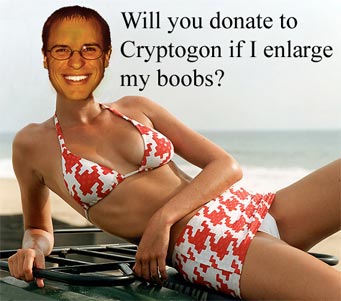 To date, Cryptogon has received $70 in direct donations, plus several pints of beer purchased by reader DG at two different bars. Trying to wake people up by running a site like Cryptogon definitely doesn't motivate too many people to kick in a few bucks to the effort; even supposedly active and informed readers such as yourselves. Just remember, nothing is free, not even boobs: Those readers who still have a bit of Xmas charity in their wallets might like to consider the heartbreaking appeal of college girl Michel, a lady very much in need of a new-year boost. Michel, 24, has launched a website asking for contributions to transform her "itty-bitty boobies" from a modest 34A to a mouth-watering pair of "big tatas (o)(o) !!!"Do you think this material is inappropriate for posting on this site? I don't. Not at all. Take a good long look. Apparently, this is where peoples' priorities are. This is where people put their money. Afterall, she has collected $470 as of 1/8/03, and she has only been at it since the end of November. I get between 80 and 180 hits per day. She's getting 1000 hits per hour. Fantastic. Related: This person blew $20,000 on crap: Maybe it was too many morning lattes that pushed me over the edge, maybe it was the Prada pumps that I bought on eBay.Then she started a site and people contributed enough money to pay off her credit cards!!! So, just to make sure we're all on the same page: - An imbecile fulfils her vapid whims and runs up a $20,000 tab (the one above is asking for fake boobs, I thought I'd ask, too). - Random people on the Internet pay for her irresponsibility and childish behavior. - Meanwhile, back at the ranch, I'm sitting here, cooking my retinas in front of this CRT, focusing on all this depressing nonsense. The page is read by all of .mil and most of .gov. Someone at Lucasfilm hits this thing regularly. Bank of America. Forbes. Boeing. Microsoft. TRW. Etc, etc. The result: two guys contributed a total of $70, another guy, a friend of mine, donated beer and my FBI file is probably three inches thick. I'd be crying if I wasn't laughing my ass off! I keep telling myself it's worth it to keep doing this, but when I'm reminded about how handsomely stupidity is rewarded in this society, it makes a guy wonder if he's going about things the right way... I mean, should I start selling pornography on this site? Does anyone think that will help? Let me put it this way: What would get you to donate? What would get you to give, say, one dollar per month? A buck a month!? I mean, it sounds ridiculous to be asking this from people who use something everyday, like, say, THIS WEBSITE! You should just do it because it's the right thing to do. Just like I should be maintaining this site because it's the right thing to do. The bad karma is on you lurkers, you quiet, frightened, dead weight, free-loading bastards! I'm trying to fire it up and most of you aren't contributing shit to the effort! To you guys who link to Cryptogon, mention it on newsgroups and message lists etc., thank you! To the rest of you who take continuously and give nothing back, get your ass down to WalMart and stick another American flag on your car. In other words: DO ABSOLUTELY NOTHING! You're not wanted here.