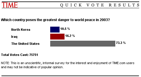 Greatest Danger to World Peace: Shocking Poll Results :.Remember, this isn't me, running a poll on my little, backwater website, with you guys skewing the results. This is Time.com, with Joe and Jane Sixpack for readers: Research Credit: CW