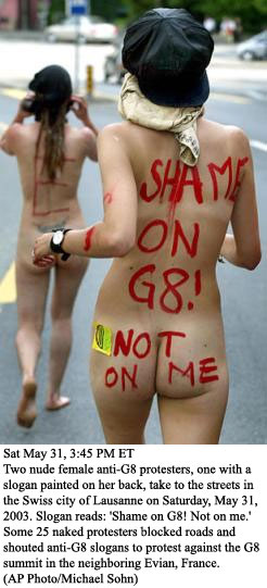 Protesters Attempt to Get G8 States to Turn the Other Cheek :. More pictures of the antics are here. It's too bad that all of this will never amount to anything. There is, however, something refreshing about seeing some freak spray painting, "All cops are bastards," on a wall and a naked woman with anti corporate slogans all over her backside. Ahhh, oblivion, it's lovely this time of year: Anti-G8 protesters have blocked bridges with burning tyres in Geneva and French police have fired teargas at activists who were trying to bar the way to the town of Evian, hours before the start of a summit of world leaders there.