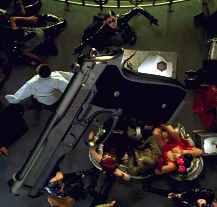 Go Commando: Sharon-Stone-Style Leg Crossing Stunt in Matrix Revolutions :.I was admiring the super high resolution Matrix Revolutions trailer when I noticed something... I was trying to read the print on the side of the Beretta 92 handgun that Trinity is trying to catch. And then, I saw, is that?? Yes it is... Take a look at the girl on the right side of the couch. Actually, take a look at her legs. I tried watching that clip at normal speed in an attempt to notice THAT, but I couldn't see it, even knowing it was there. It's so brief. I could only consciously see it when the action was paused. Now, why would I mention the presence of a subtle depiction of a woman's crotch in a few frames of a movie? That was obviously done intentionally, but for what purpose? Is it just the filmmakers messing with our heads a little bit? Leaving a little signature on a complex special effects scene? Maybe. The subconscious, however, sees stuff like that. Your brain assimilates that, whether you're aware of it, or not. I'm wondering what else one might find in these Matrix films... one frame at a time.