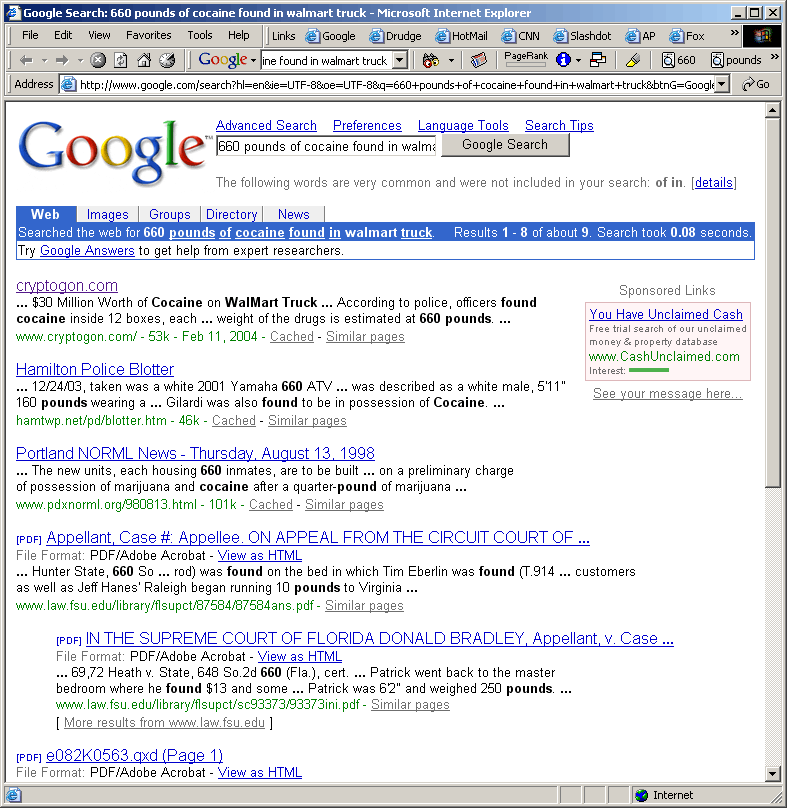 Type "660 Pounds of Cocaine Found in Walmart Truck" Into Google :.Oh yeah, that's right! I'll take that. *bow* I need a screenshot of this. HAHAHA! Here's previous Cryptogon coverage of this story. Note: walmart truck cocaine also works.