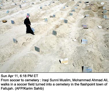 The Siege of Fallujahgrad :.Remember the Nazi siege of Leningrad? Well, now the besieger of cities in Iraq uses PSYOPS/propaganda foils, like calling for a cease fire, to allow for combat re-supply of fuel and ammunition after all of it was expended in the killing of hundreds of women, children and elderly. Oh woops, the mercenaries tasked with delivering fuel and ammo to the real soldiers have a nasty tendency of being blown up before they can deliver their goods: More than 600 Iraqis, mostly women, children and the elderly, have been killed in a week of fighting in Fallujah, Rafie al-Issawi, the director of the city hospital, told The Associated Press. But a marine commander claimed most of the dead were probably insurgents.Click here or here or here or here to see what "probably insurgents" means. More food for thought from this article: A $35 million attack helicopter was shot down by a group of men armed with assault rifles (probably AK-47 type that cost anywhere from $25 to $300 in most parts of the world).