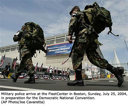 The epicenter of the security was the FleetCenter, where the four-day convention will be held. Camouflaged military police officers staked out the elevated subway lines overlooking the Fleet, while bomb-sniffing dogs and officers roamed nearby streets.