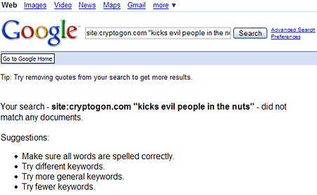 I remembered that phrase, so I knew it was on my site… Somewhere. Luckily, the WordPress search engine doesn’t forget. Neither does Dogpile metasearch, which has the Cryptogon page in question indexed properly. [UPDATE] Google indexed a recent story (“We’re Inching Dangerously Close to the Point Where Consumers Run for the Hills”) that contains the phrase “kicks evil people in the nuts,” but not the original article from which the quote was taken (MEXICO GAS LINE EXPLOSIONS FORCE MAJOR FACTORIES TO CLOSE DOWN).