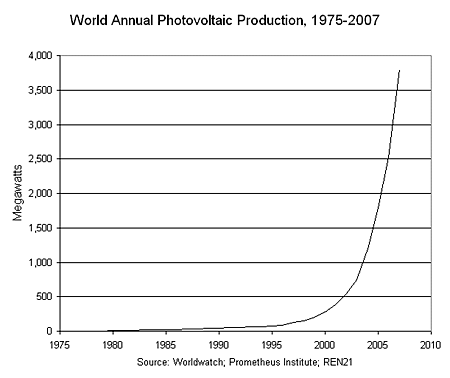 According to The Earth Policy Institute production of photovoltaics (PV) jumped to 3,800 megawatts worldwide in 2007, up an estimated 50 percent over 2006. At the end of the year, according to preliminary data, cumulative global production stood at 12,400 megawatts, enough to power 2.4 million U.S. homes. Growing by an impressive average of 48 percent each year since 2002, PV production has been doubling every two years, making it the world’s fastest-growing energy source.
