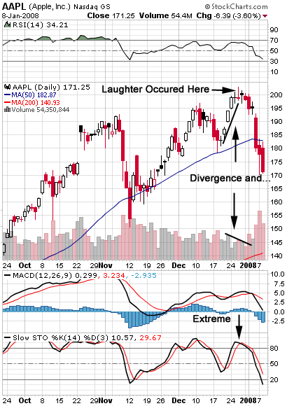 When Apple (AAPL) was up around $200 recently, I scoffed, chortled and thought, “How f*!@#$% ridiculous that this thing is $200.” I brought up the chart and laughed some more.