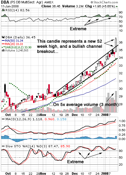 I almost fell out of my chair when I saw the one day gain on PowerShares DB Agriculture (DBA). It was up 5.65% at $36.45. You may remember that I put out my first bullish call on DBA when it was trading around $27 back on September 18th of last year.