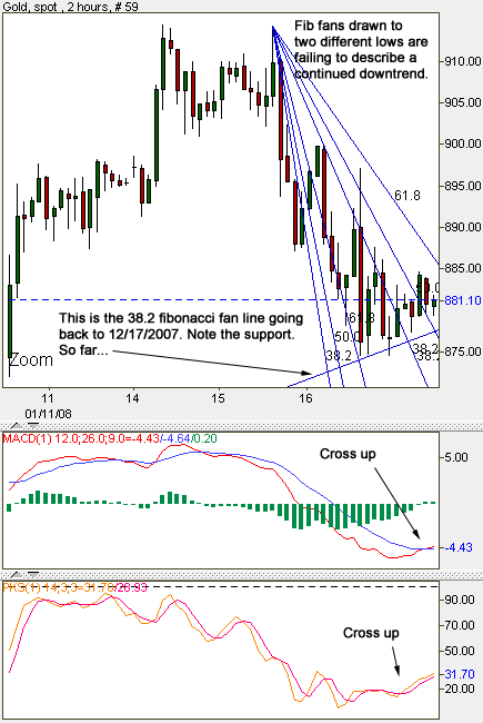 If it can manage to breakdown below $888, look for support around the first fib fan line.