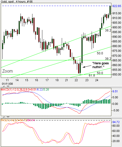 2) $850 was the 50% retracement level on the Fibonacci grid (drawn from the low on December 17, 2007 to the high on January 14, 2008).