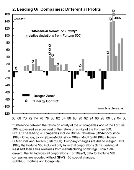 Each bar in the figure measures the difference between the rate of return on equity of these companies and the average rate of return on equity of the Fortune 500 benchmark (with the result expressed as a percent of the Fortune 500 average). The grey bars show years of differential accumulation; that is, years in which the leading oil companies beat the average with a higher rate of return. The black bars show periods of differential decumulation; that is, years in which the leading oil companies trailed the average. For reasons that will become apparent in a moment, these latter periods signal ‘danger’ in the Middle East . Finally, the explosion signs show ‘Energy Conflicts’—namely, conflicts that were related, directly or indirectly, to oil.[7] The figure exhibits three related patterns, all remarkable in their persistence: