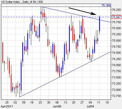 Ok, the trouble in Europe caused a big move higher on the dollar. As a result, this bearish triangle is failing.