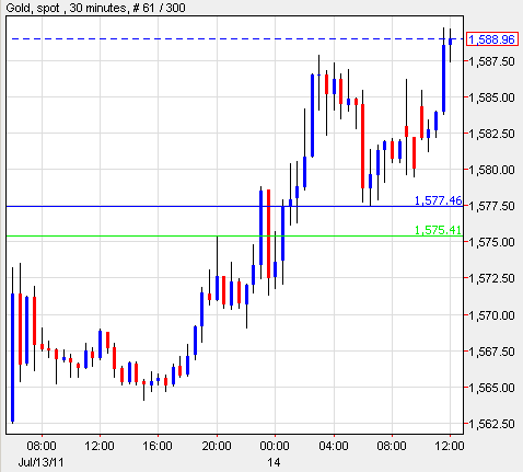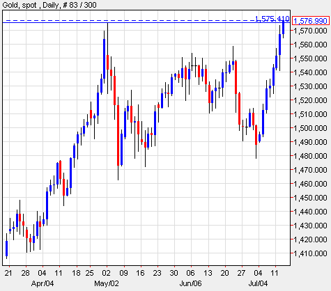 Intraday support at $1577.46, above previous record high of 1575.41. Bullish.
