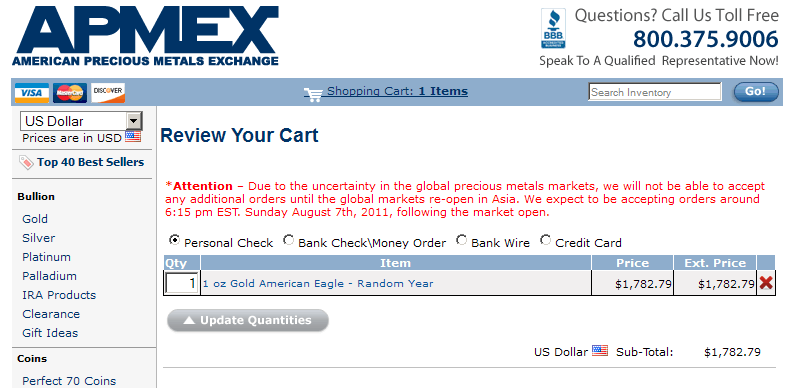 *Attention – Due to the uncertainty in the global precious metals markets, we will not be able to accept any additional orders until the global markets re-open in Asia. We expect to be accepting orders around 6:15 pm EST. Sunday August 7th, 2011, following the market open.