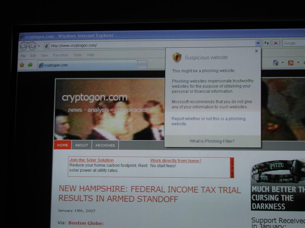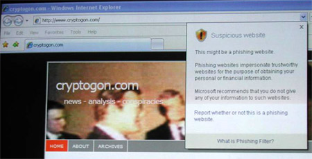 Screenshot of Microsoft Internet Explorer 7 warning users that Cryptogon is a, “Suspicious website.” Here’s a large version of the image.