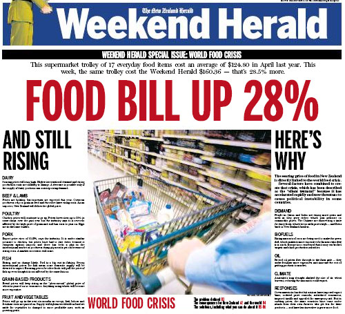 April 26th, 2008I feel pretty silly for being coy about mentioning specifics related to the food situation here in New Zealand recently. Look at what was plastered across the New Zealand Herald front page today, in Second-Coming-of-Jeebis typeface: