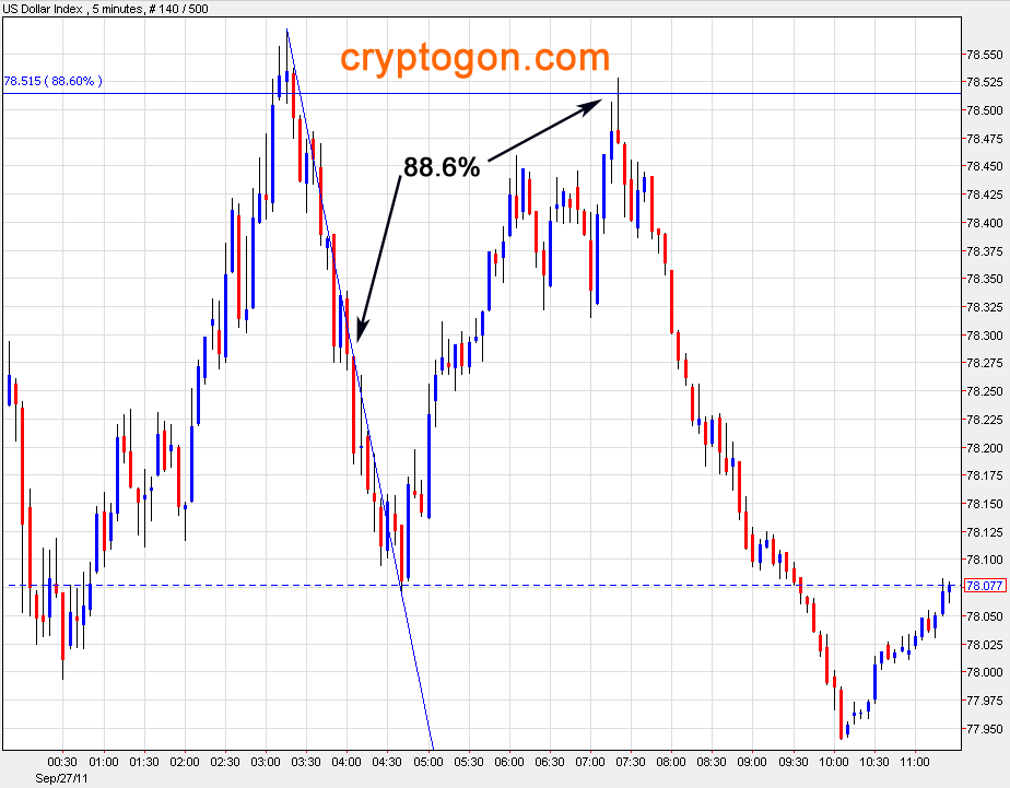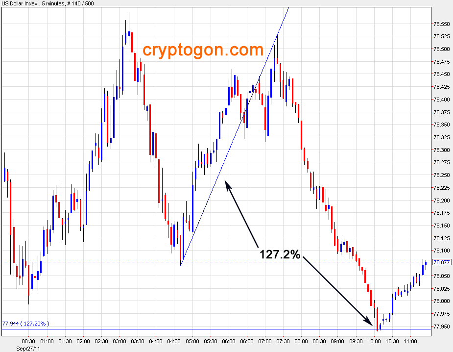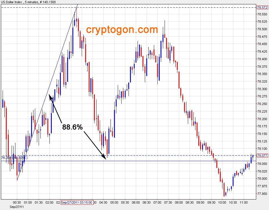 I was just examining the recent gold slaughter by looking at the U.S. Dollar Index and I noticed a fantastic series of Fibonacci setups on the current five minute dollar index chart.