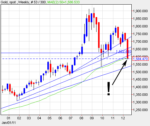 The spot gold weekly candle is down through the 50EMA just now. Make or break.