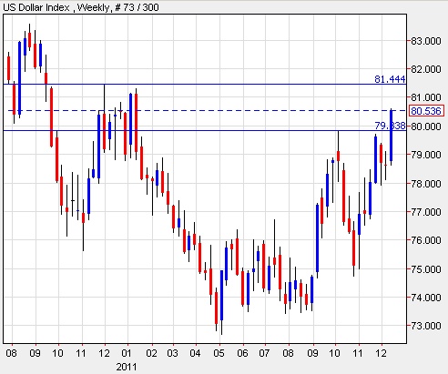 The dollar has clawed its way up and out of the recent range on the European chaos. Look for some resistance in the vicinity of 81.444.
