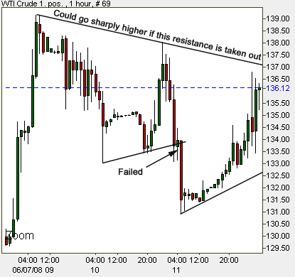 Really quick, watch that symmetrical triangle forming on the intraday charts. Translation: Breakout higher from previous range possible. It could go sharply higher on this formation.