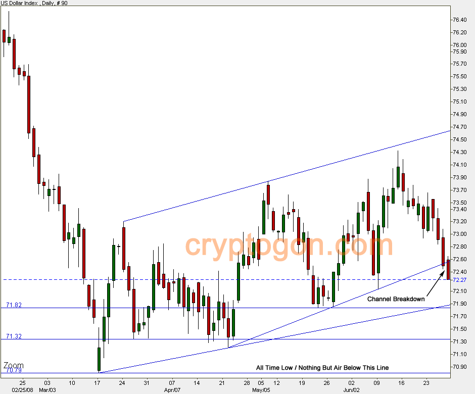 There are several supports down here, but if the European Central Bank does raise rates on July 3rd, that could cause [more] trouble for the dollar. That maybe break below the channel could be insiders positioning themselves ahead of the news.