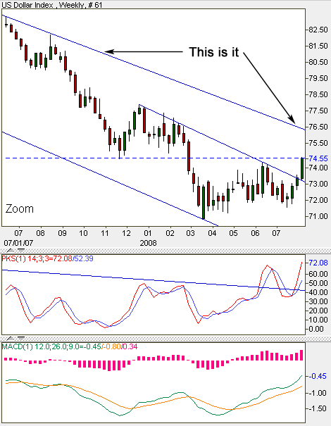 I’m not staying short the dollar if we get a weekly green candle close above that upper channel line.