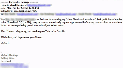 Michael Hastings contacted WikiLeaks lawyer Jennifer Robinson just a few hours before he died, saying that the FBI was investigating him.