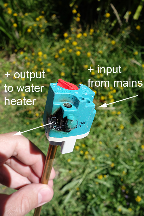 3. So, with all electrical supply places closed and messages left on multiple electricians’ 24-hour response lines being ignored, I decided to conduct an experiment. Rather than trying to wash dishes and my filthy creature sons with cold water, I wired up the hot water cylinder without any thermostat inline and flipped the breaker to ON. (Don’t try this at home, you might poke your eye out.) Then I sat by and watched… as the hot water cylinder uneventfully heated the water without any problems at all. The water had been lukewarm so I just let it run. After about 15 minutes, I felt the wires—Ambient temperature. After a half hour—Ambient temperature. After an hour—Ambient temperature. All the time, the water was getting hotter and hotter. Finally, after about an hour and a half, with the water at 52C, I shut it down. The input wiring still felt right around ambient temperature.