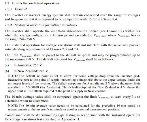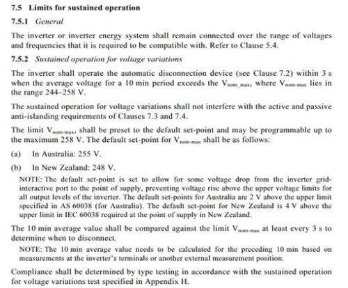 According to AS/NZ4777.2 ‘Grid Connection of Energy Systems via Inverters’ Clause 7.5.2 ‘Limits for Sustained Operation’, inverters shall automatically disconnect if the average grid voltage over a 10 minute period exceeds 248V, see excerpt from AS/NZ4777.2 below. Seeing as the Powerwall contains an inverter, we have to comply with the standard. The only way to fix this is to contact the DNSP/DNO. They usually launch an investigation and if they determine the grid is non-compliant, they will reduce the grid voltage at the transformer. If they determine otherwise, there is nothing we can do.
