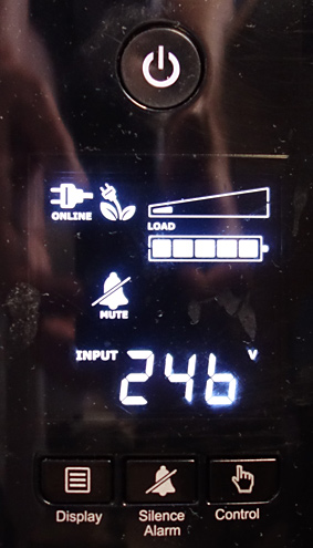 The legal limit is 230v + or – 6%, or 243.8v on the high end. Here’s a recent picture of my UPS, which shows the grid voltage: