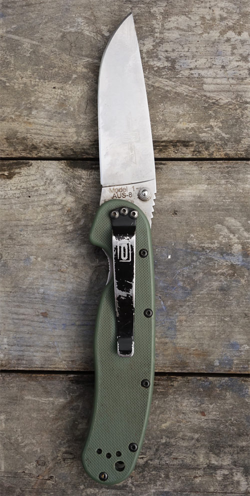 Earlier today, I sat down with Reed and we took the knife completely apart to clean and oil it and see how it’s holding up. It had a bit or dirt and sand between the handles and the scales. There was a small amount of surface rust on the tang near the pivot. We were able to remove the rust with a couple of drops of 3-in-One oil on a rag. Other than that, a bit of the black finish had rubbed off the clip and the little logo that was on the blade had also worn off. Despite batonning, the liner lock was perfect. With a hint of 3-in-One on all the metal parts, we reassembled the knife and it was ready to go again.