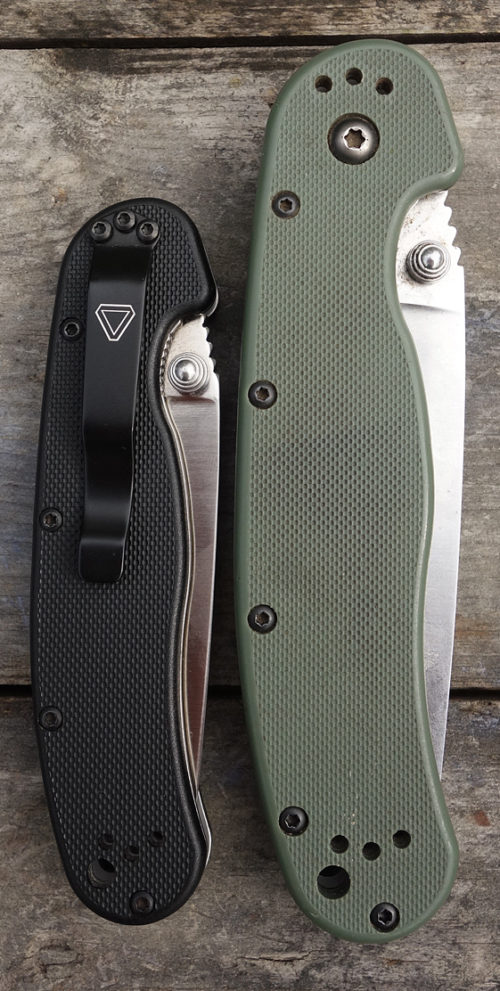 The Ontario RAT folding knives come in different sizes, colors, handle materials and blade steels. The RAT-1 is the big RAT, the RAT-2 is much smaller. I bought a RAT-2/AUS-8 for myself (black knife on the left in the picture below). I hardly notice it for EDC around our farm. I paid $25 for that knife, which is an unbelievable value in my opinion.