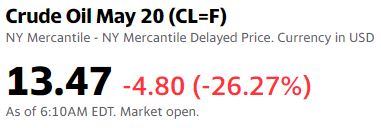 West Texas Intermediate crude for May delivery tanked 98%, or $18.04, to trade at 19 cents per barrel, its lowest level on record. At the session low, the contract traded at 1 cent. Meanwhile international benchmark, Brent crude, which has already rolled to the June contract, traded 6.3% lower at $26.30 per barrel. The June WTI contract, which expires on May 19, fell about 10% to $22.54 per barrel. The July contract was roughly 5% lower at $28 per barrel.