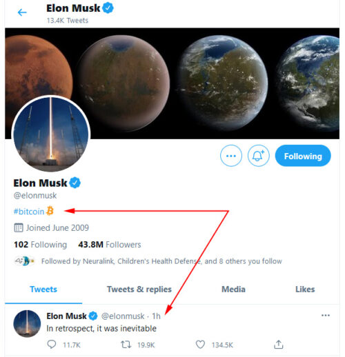 While the exact reason for the bullish move is hard to define, prices surged after Tesla and SpaceX CEO Elon Musk changed his Twitter bio to mention the cryptocurrency.