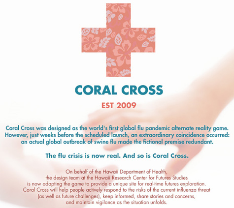 As part of a larger public engagement initiative that includes community meetings and a live TV panel, the Hawaii State Department of Heath has contracted with the Hawaii Research Center for Future Studies to produce Coral Cross, a “playable scenario” on the island of Oahu. According to Judy Kern at the Communications Office of the Hawaii State Department of Health, the goal of the ARG is to “help encourage public dialogue and elicit input for decision-makers on Hawaii’s pandemic priorities.”